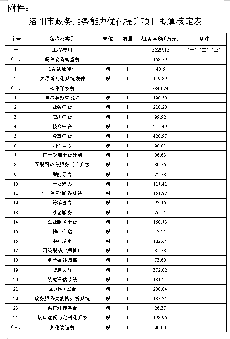 市政务服务和大数据管理局: 你局《关于报送洛阳市政务服务能力优化提升项目初步设计的函》(洛政数〔2021〕24号)及相关材料收悉。经研究,原则同意由河南省信息咨询设计研究有限公司编制的《洛阳市政务服务能力优化提升项目初步设计》,现就项目初步设计及概算批复如下:一、本次政务服务能力优化提升项目建设范围涵盖市本级、县(区)、乡镇/街道、社区/村,对于原有区县信息化政务平台